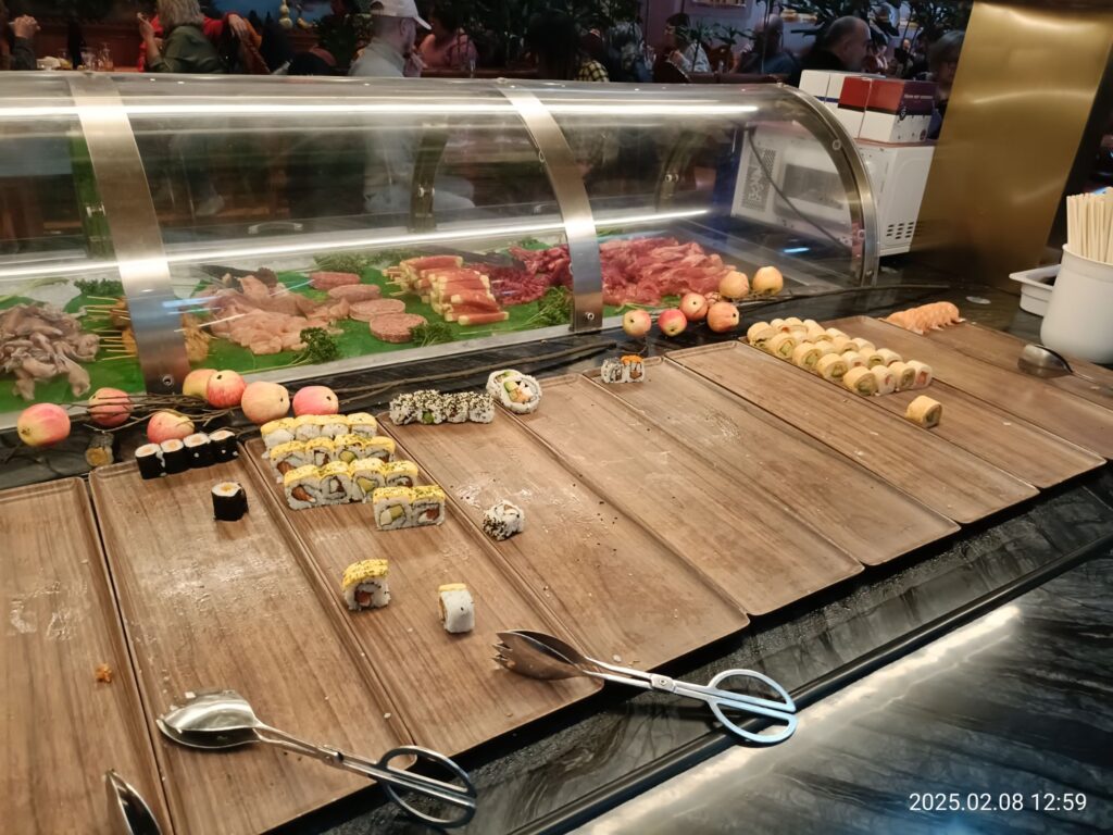 寿司もあります。海外でありがちなびっくりな組み合わせのものはなく、せいぜいクリームチーズが入ったカリフォルニア巻きくらいでした(許容範囲)。サーモン寿司、アボカド巻き、マグロ巻きなどがありました。酢飯が個人的には甘すぎ、あと柔らかいのがちょっと残念でした😅