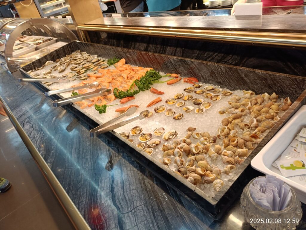 冷製の海鮮コーナー。貝類やエビ、カニもあります。