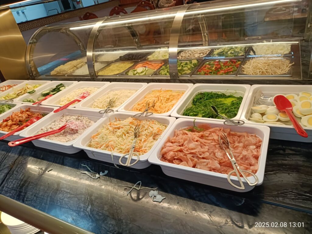 こちらはサラダコーナー。モズクみたいな海藻があったので試しに食べてみました。甘酢のような味付け、タレまでショッキング緑(さては人工的に色付けしてるな)😅