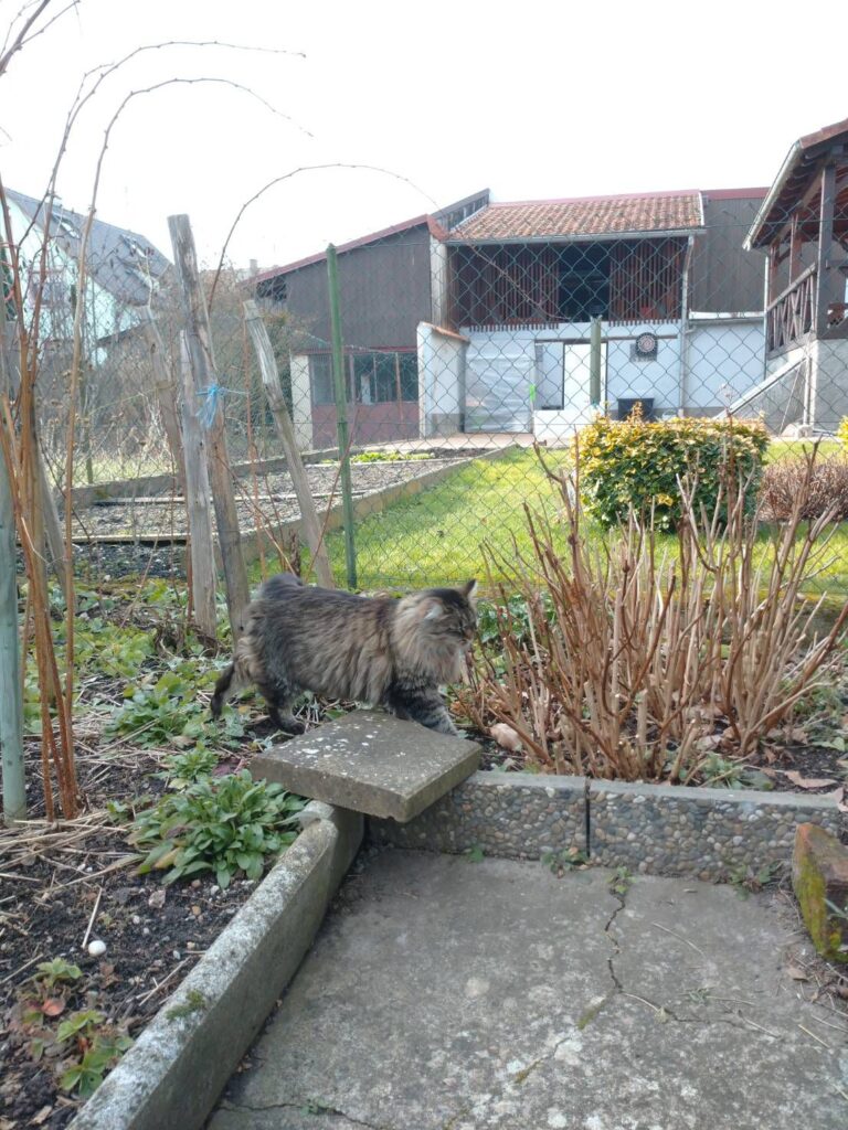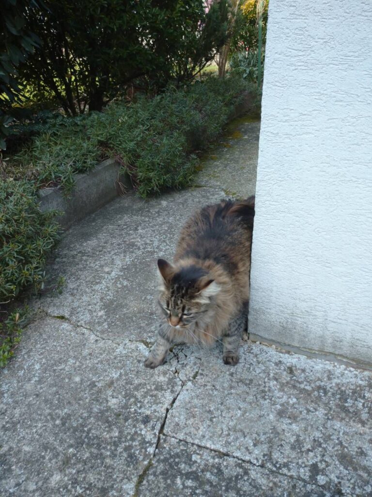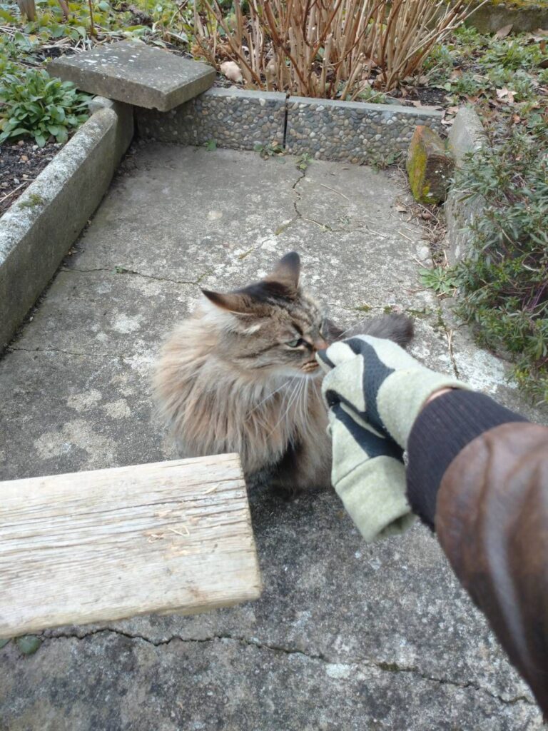 ここで真打ち登場!😆おじいちゃんおばあちゃんちの猫ちゃん、ルビネットちゃんです。お散歩からちょうど帰ってきたところみたいでにゃんにゃん言いながら寄ってきました😍ふっさふさの毛がなんとも優雅。