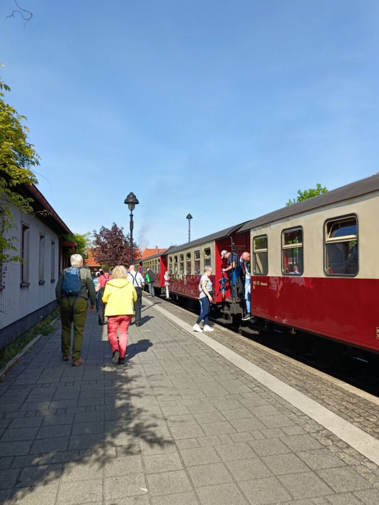 と、言うことでブロッケン山ハイキング無事完遂しました。終始なだらかな道で登山用の靴じゃなくても余裕で登れました。明日がワルプルギスの夜なので魔女の格好をした人がたくさんいるかなと思っていたのですが、思ったほどいなかったです(私たちのように魔女帽子を被った人が何人かいたくらい)。ハイキングしている人もドイツの人が多いようでアジア人の私たちはだいぶレアキャラな感じになっていました😆魔女帽子も被っていたせいか「帽子良いね」みたいに話しかけてくれた人も何人かいました😊ハイキングは通常車がないとアクセスできないような道が多い中、ブロッケン山の場合はヴェルニゲローデから情緒あふれる蒸気機関車でアクセスできるのもおすすめポイントです。お天気に恵まれ、とっても楽しいハイキングになりました。