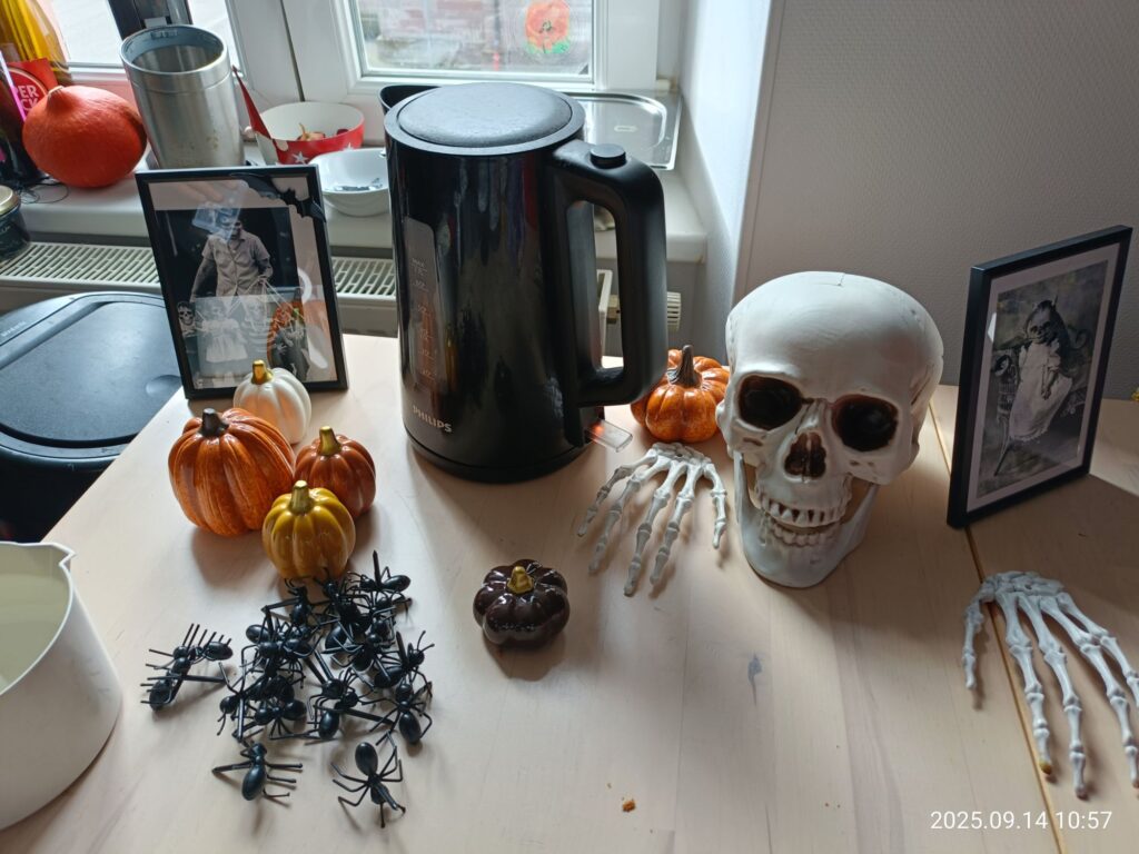 朝寝坊してお家に朝ごはんを食べに行ったときの写真。よく見たらアリさん以外にもたくさんのハロウィングッズが。