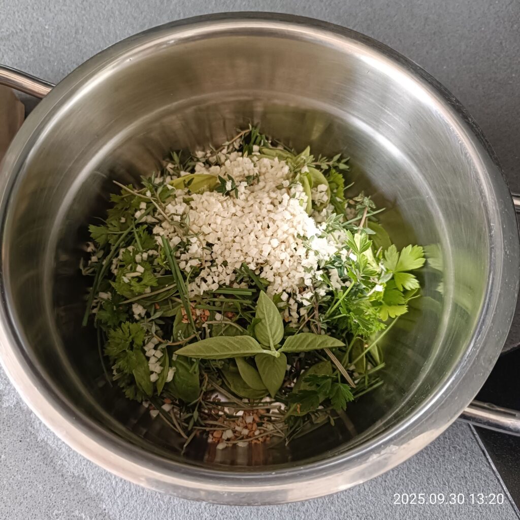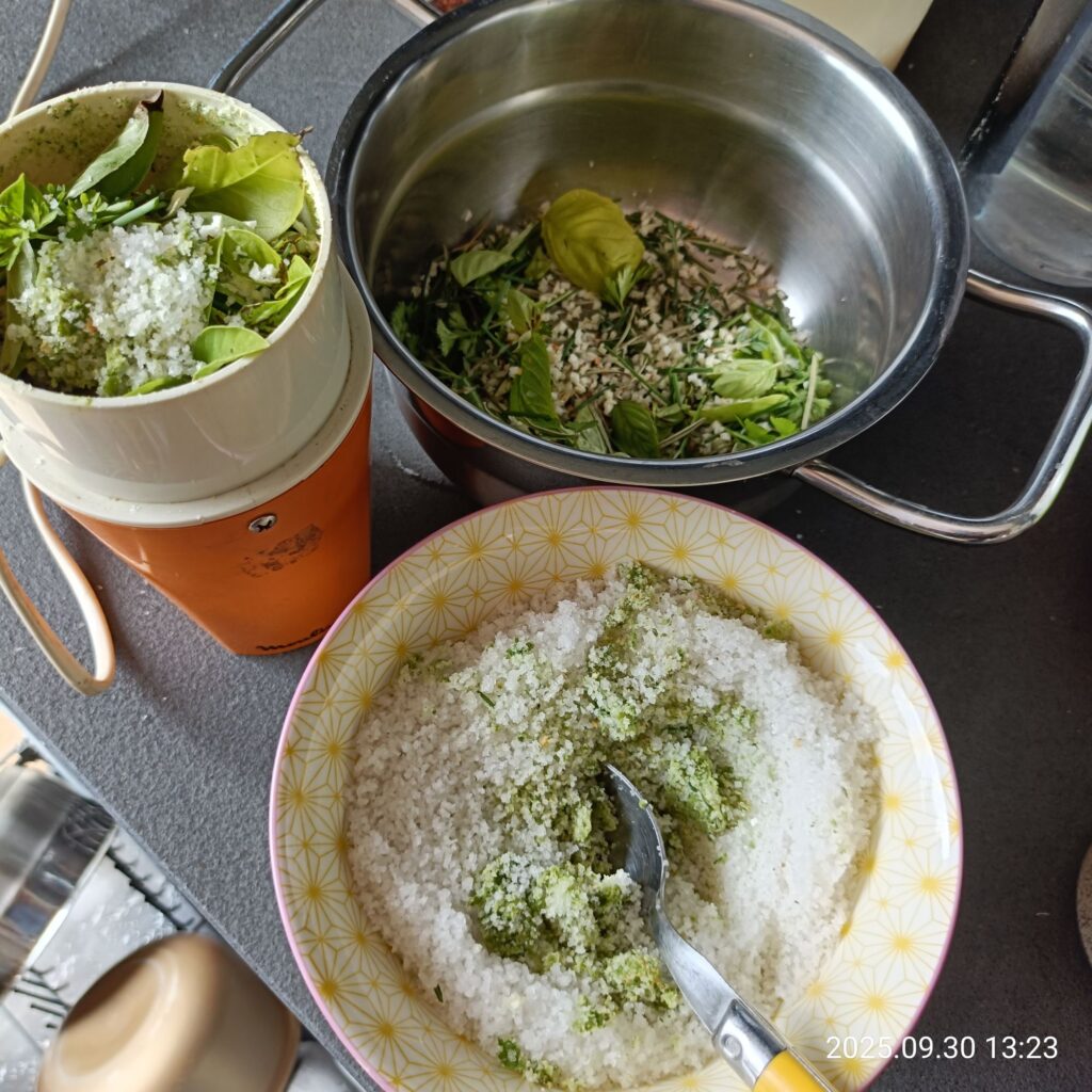 我が家で使っているBioのハーブ塩。13種類の野菜やハーブが入っているもので色々な料理に便利に使っています。でもこちらお店で買うと500gで8ユーロくらいのなかなかいいお値段なので、ふと自家製でもできるのでは?と思い立ちいざ実践😁