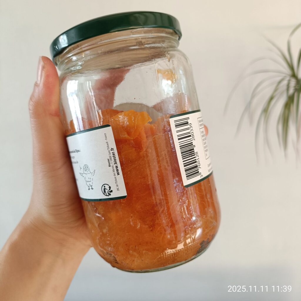 [季節の果物】Kaki (柿) BIOの製品 X Facebook はてブ Pocket LINE コピー 2025.11.122025.11.17 勤めているお店で柿が店頭に並ぶようになりました。柿はフランスでも「Kaki」と呼ばれています。Bioのお店では1kg5€くらいで売っています。 味はおなじみの甘柿😊ものによっては種がないものも。熟したものはとっても甘くてとろとろ😍 いくつかの柿を使って柿酢を作ってみることにしました。熟した柿を皮ごとつぶして瓶に入れ、常温においておくと自然に発酵してお酢ができるとか…!出来上がりが楽しみです😊 この記事を楽しんでいただけたら「いいね👍」していただけると嬉しいです😊