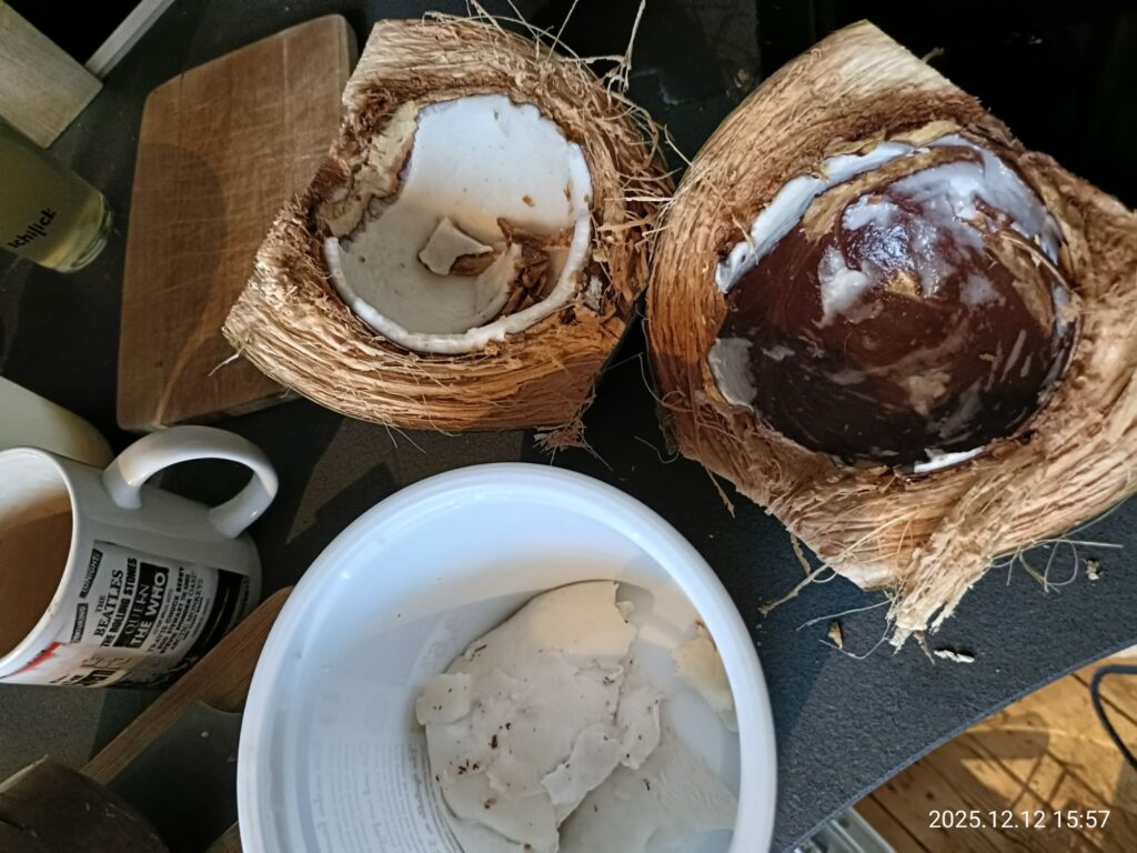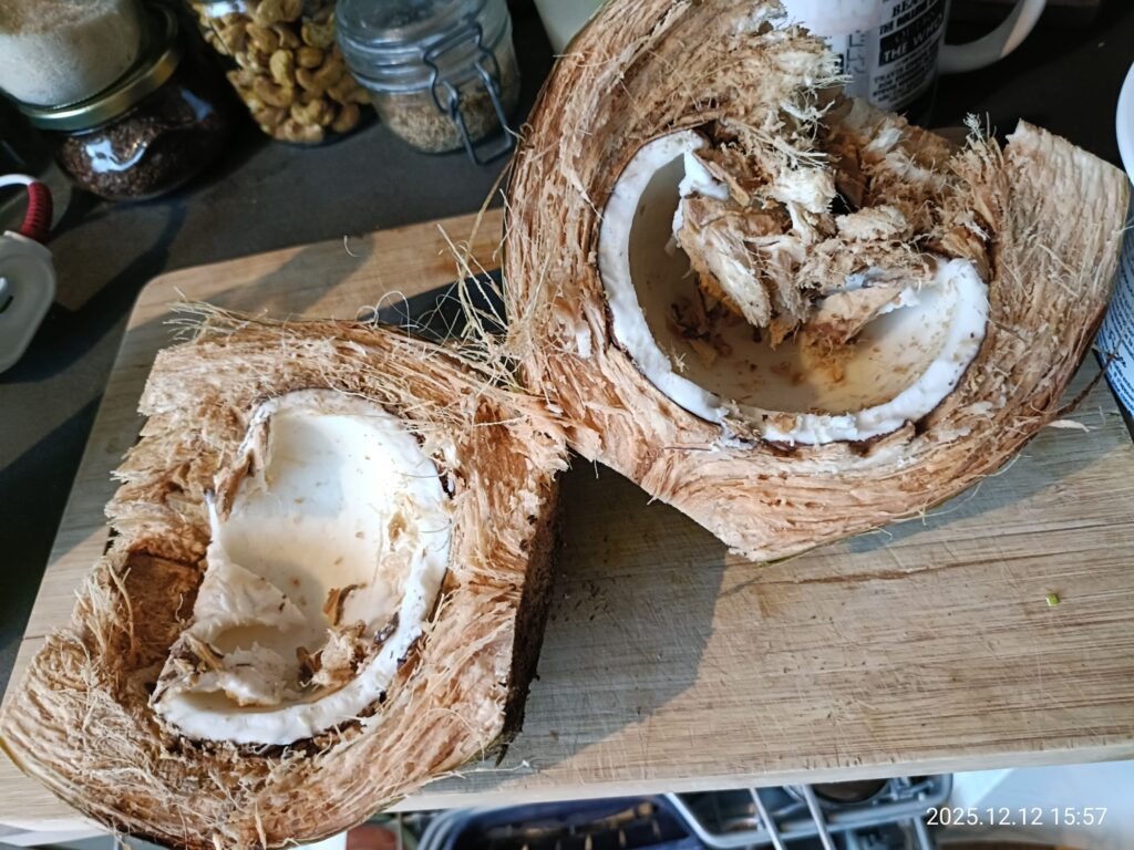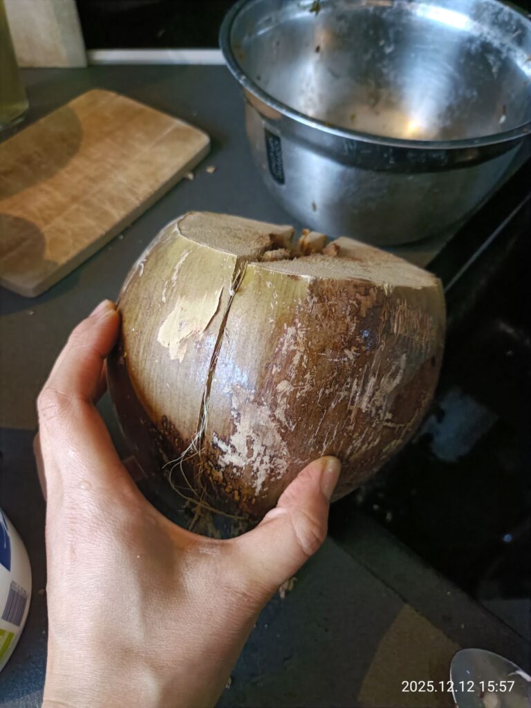 まずはココナッツウォーターを取り出します。1つのココナッツから300㏄くらい取れました。のんでみるとほんのり甘くておいしい~😋