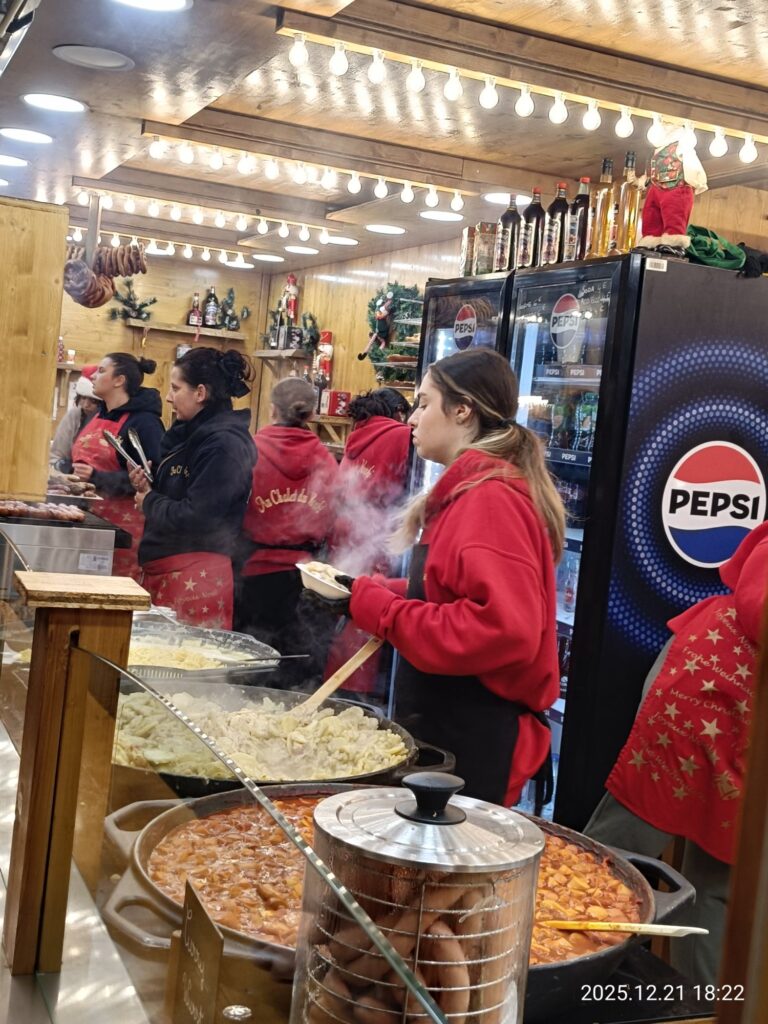 お値段としては手前のお姉さんが持ってるジャガイモとベーコンのチーズ煮込みのような料理が12€。外食にしたら安いけど量を考えるとやっぱり割高😅