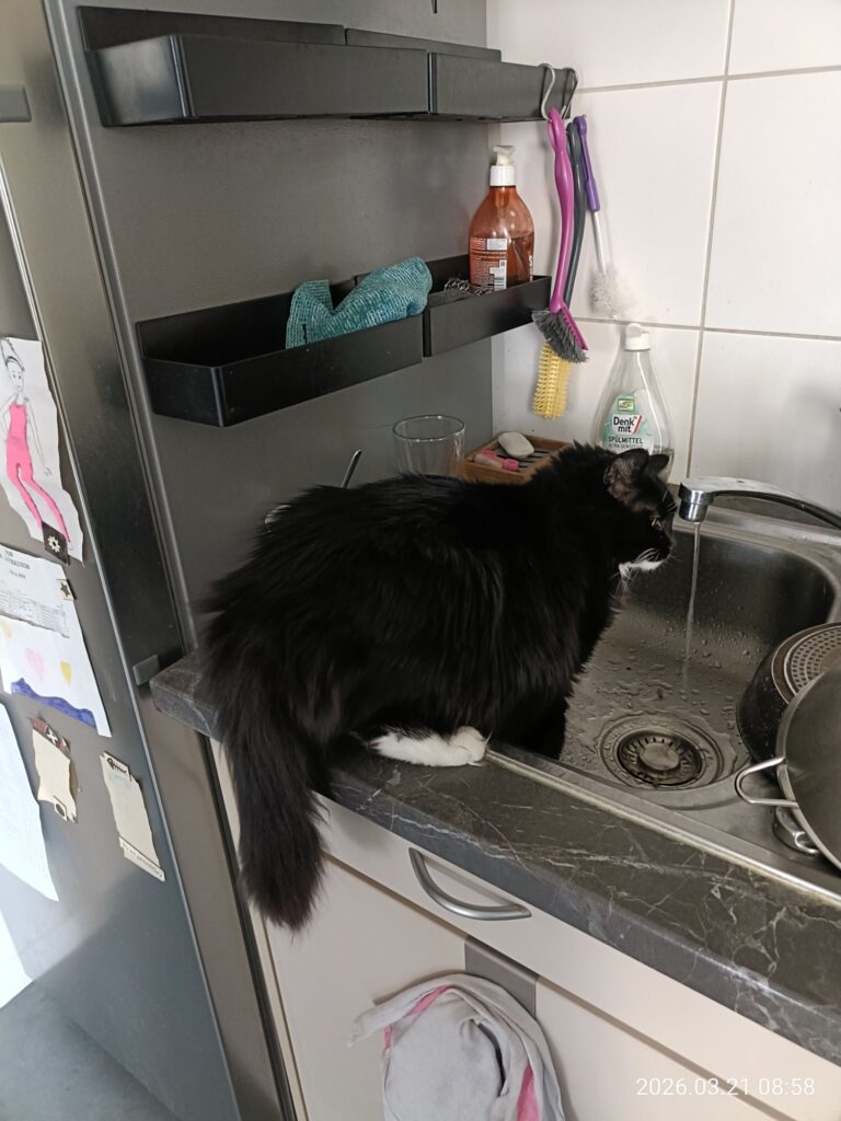 カリシーちゃんは水道の水が気になる模様。細く水を出してあげたらぺろぺろ飲んでました。