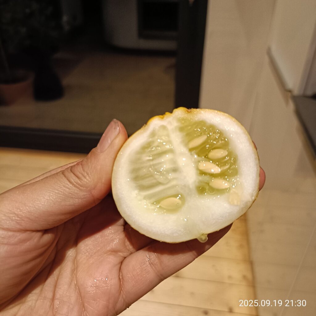 切ってみました。果肉は白くて種多め。お店のディレクターによるとカルパッチョにして食べるのがおすすめとのこと。