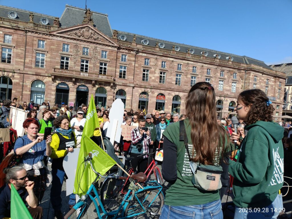 デモ開始前にいくつかの団体の代表者がスピーチをしました。今回のデモのテーマは「Climat,Justice,Liberté(環境、正義、自由)」です。私たちを取り巻く様々な問題に対して、自分たちの大地、権利、未来の世代を守っていこう!というような内容になります。