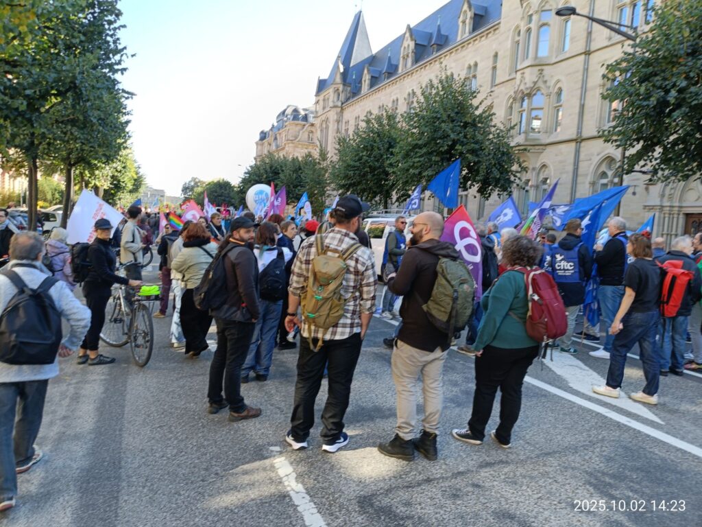 今回もいくつかの労働組合が参加していて、それぞれの団体カラーのベストや旗を身に着けた人たちがたくさん。